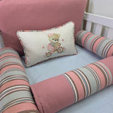 O Kit Berço Ursinha de Bicicleta combina suavidade e fofura em uma paleta encantadora de rosê, marrom, cinza e creme, dando ao ambiente um ar acolhedor e harmonioso.