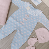 Encante-se com a delicadeza do nosso conjunto Doce Encanto, pensado para os primeiros dias mais especiais da sua princesa. Composto por 5 peças em tricô macio e aconchegante, o kit traz um macacão azul com corações rosados e golinha de tule poá, além de detalhes em laços que tornam o visual ainda mais encantador.
