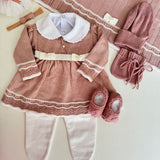 Encante o primeiro look da sua bebê com esta saída de maternidade em tricot rosé, delicada e atemporal. O conjunto combina conforto macio de recém-nascido com acabamento premium: vestido em tricot com gola peter pan e pérolas sutis, macacão com pezinho, manta coordenada e acessórios que deixam a foto da maternidade simplesmente inesquecível.