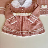 1 Vestido em tricot rosé, com gola branca e cinto com lacinho e pérolas